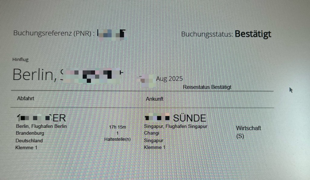 Ich habe heute noch einmal die Buchungsbestätigung gecheckt und für uns geht’s im August mit „Wirtschaft“ von „Berlin Klemme 1“ nach „Sünde“, „Abfahrt“ ist 16:30 Uhr, Reisezeit 17 Stunden und es wird nur eine Haltestelle geben. So zumindest der automatische Übersetzer im Web Browser. Die „Haltestelle“ liegt in Nahost. Wunderbar. …