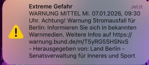 Heute, am 7. Januar um 9:30 Uhr, erreichte uns dann die nächste Warnung per Cell-Broadcasting. Stromausfall in der gesamten Stadt. Das war aber dann eine große Cell die da bebroadcasted wurde … und man wunderte sich, was das nun wieder soll.