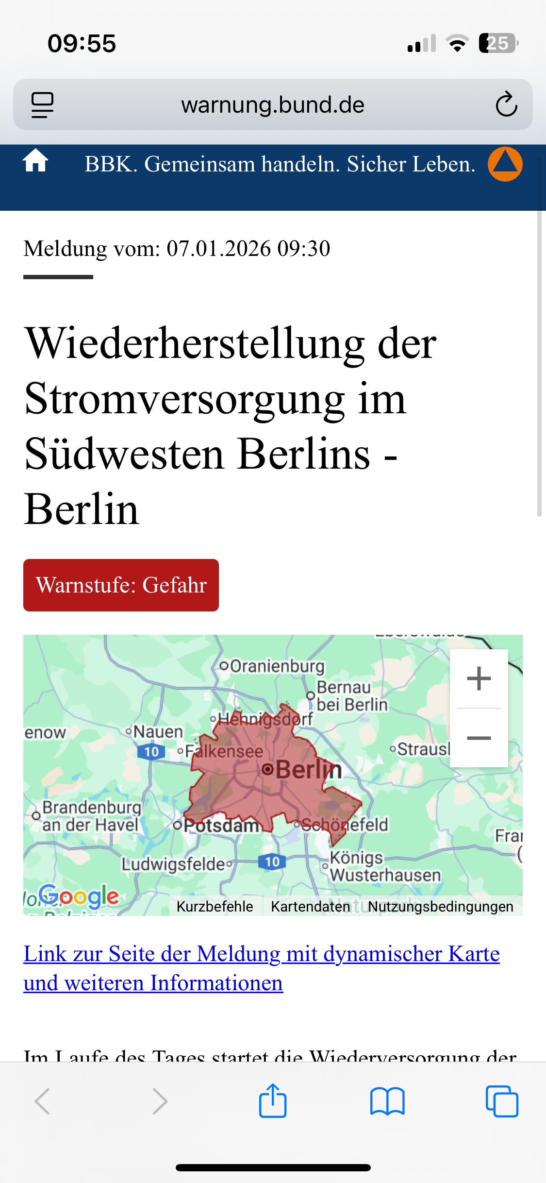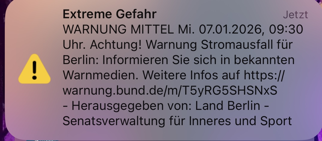 Heute, am 7. Januar um 9:30 Uhr, erreichte uns dann die nächste Warnung per Cell-Broadcasting. Stromausfall in der gesamten Stadt. Das war aber dann eine große Cell die da bebroadcasted wurde … und man wunderte sich, was das nun wieder soll.