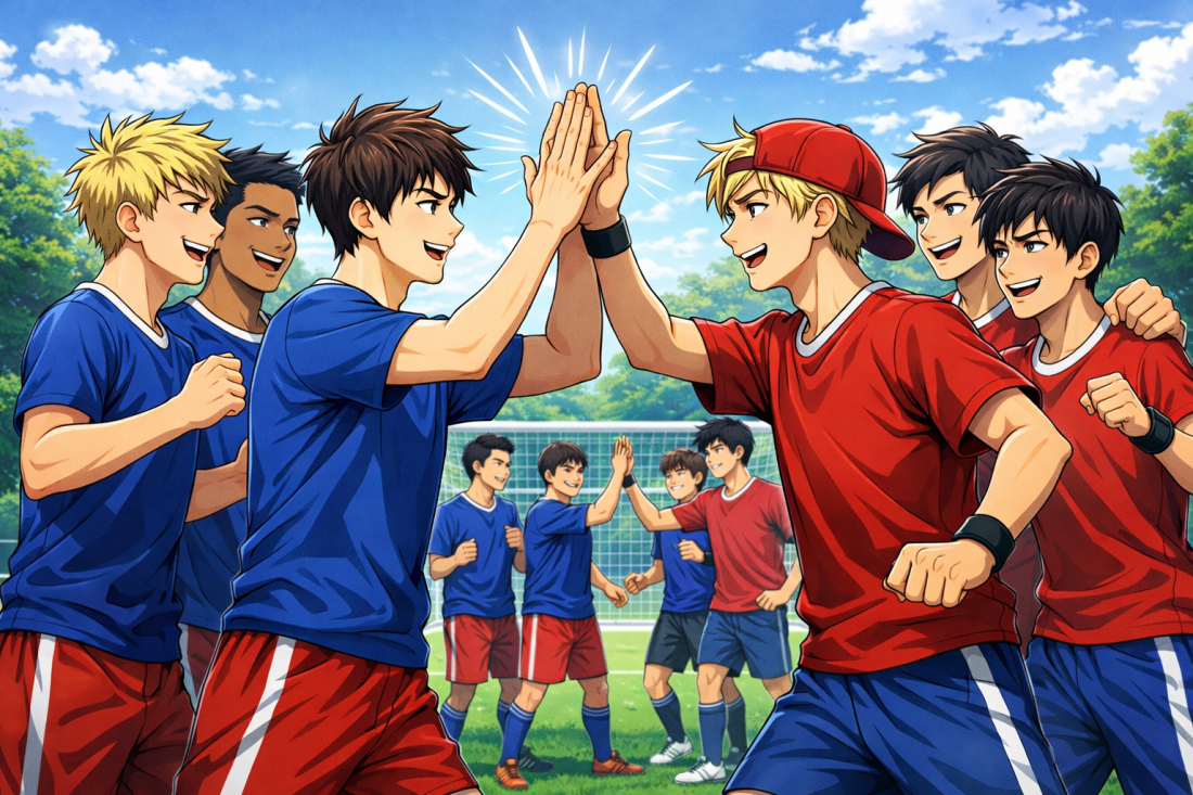 Die verbliebenen „Roten“ gingen zu den „Blauen“ hinüber und machten eine Fortsetzung des Spiels klar. Außerhalb der Wertung. Trainer und Platzwart waren nicht zu sehen. Einige der „Blauen“ warfen sich rote Jacken über. Der blaue Stürmer ging ins blaue Tor, der blaue Torwart stellte sich bei uns zwischen die roten Pfosten, unser Keeper verstärkte das rote Mittelfeld.