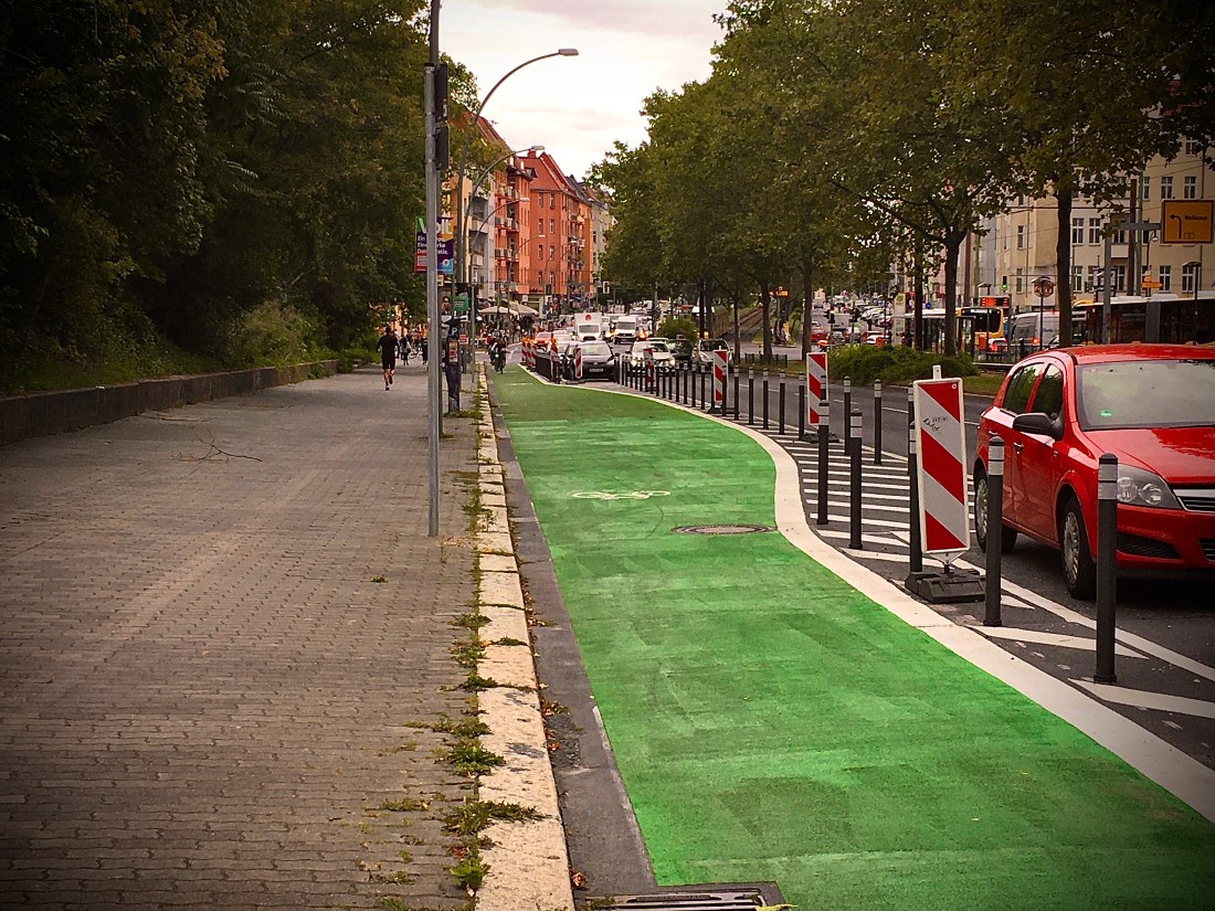 Berlin arbeitet an der der Verkehrswende; teilweise tauchen echt breite Radbahnen auf. Der klassische Straßenverkehr wird enger.