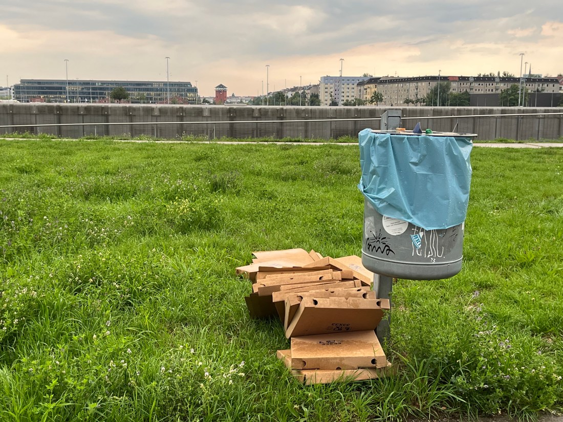 Dann drehe ich die Kopfhörer ein paar Stufen lauter und stehe maximal 10 Minuten am Straßenrand gegenüber eines Hauseingangs, um dort auf den Stammhalter zu warten und werde in der Zeit 20 mal verscheucht oder angesprochen. „Darf ick mal“ oder „Ick müsste mal an mein Fahrrad“ oder „Haben Sie Pizza bestellt?“ oder „Dit is‘n Radweg man!“ oder „Tschuldigung, hätten `se mal `n bisschen Kleingeld“. Von rechts riecht’s nach Döner, von links nach Eisdiele, von vorn nach Drogerie und von hinten nach Mülltonne. Weil da eine steht. Stand letzte Woche auch schon hier.