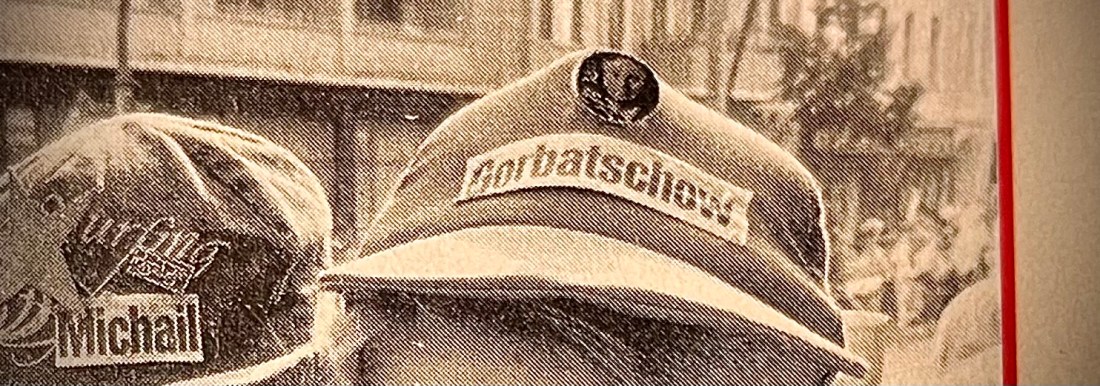 Wie üblich wurde erwartet, entsprechende „Winkelemente“ mitzuführen (so etwas wie Fahnen, Blumen, Wimpel, Schleifen … Zeugs womit man halt winken kann). Und da mein Freund und ich darauf überhaupt keine Lust hatten, kamen wir auf eine andere kreative Idee. Wir schmückten unsere Basecaps (keine Ahnung, woher wir die damals hatten) mit dem Namen „Michael Gorbatschows“. Einer Michael, der andere Gorbatschow. Die schnitten wir aus der Zeitung aus und befestigten sie mit Sicherheitsnadeln am Schirm der Mütze. Zusätzlich fertigten wir einen Sticker, dazu nahmen wir einen anderen Sticker, klebten ein Foto von Gorbi drauf und verpackten das ganze wasserdicht mit Klebeband.