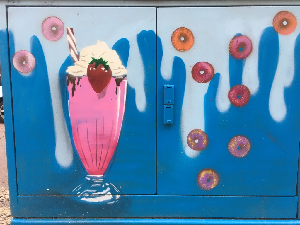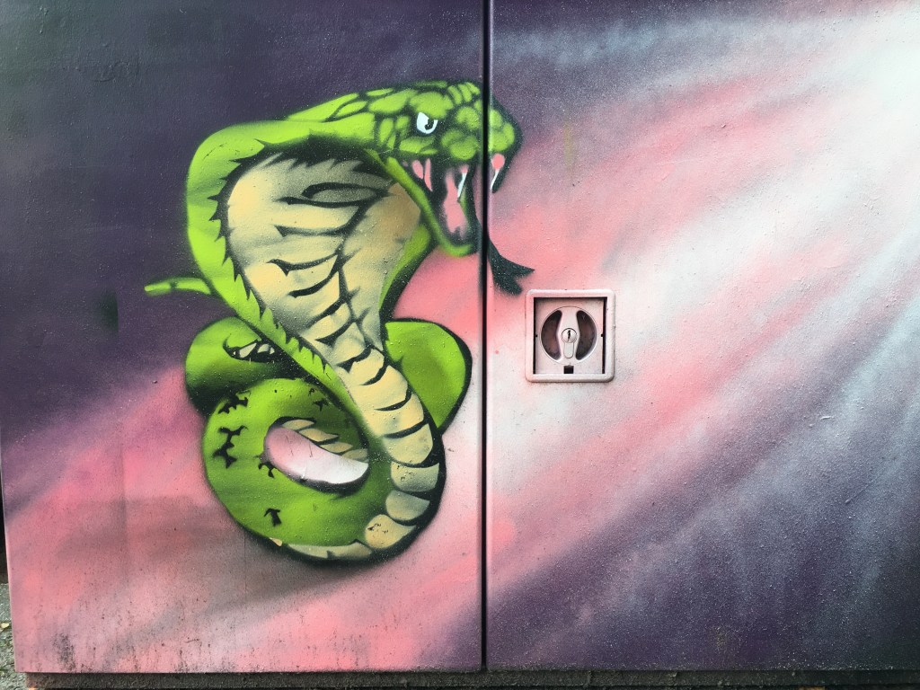 Eine Schule im Viertel hat letztes Jahr einen Deal mit dem Energie-Versorger gemacht und durfte die Stromkästen in der Umgebung gestalten. Und dabei sind auch coole Motive entstanden. Die haben‘s halt auf dem Kasten 😉