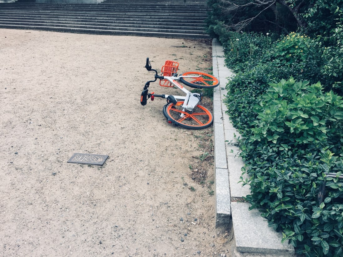 Der hier nun nachfolgend beschriebene Trend in unserer Stadt basiert gleich auf zwei egoistischen Fundamenten. Zunächst begann alles mit Bikesharing-Anbietern, die ihre Fahrräder an entsprechenden Stationen, quer im Stadtgebiet verteilt, anboten. Eigentlich eine tolle Idee. Kann man doch zu einer Station in der Nähe gehen und auf ein Fahrrad umsteigen. Dann, es war wie über Nacht, wurde die Stadt auf einmal von orangenen Fahrrädern überschwemmt, die plötzlich an jeder Ecke standen. Wer hatte die da alle abgestellt? Wo kommen die alle auf einmal her? Und kurz darauf folgten dann noch grüne Räder und dann auch noch gelbe Ausführungen. Und zwar in echten Mengen bzw. Massen. Die Räder waren technisch so ausgestattet, dass man sie quasi überall anmieteten und dann, dank eines integrierten Ständer, wieder stehen lassen konnte. Egal wo man wollte. Sie waren nicht mehr an eine Station gebunden. Für die einen war das vielleicht super-bequem und hip. Andere empfanden es wiederum als das größte Metallwaren-Lager der Stadt. Ich würde mich zur letzteren Gruppe zählen. Natürlich braucht eine Großstadt neue Konzepte, um den Verkehr zu meistern, aber so etwas planloses und ignorantes? Die Anbieter stellen ihre Räder einfach auf öffentlichem Straßenland ab und überlassen das Metall sich selbst und der Schwarm-Intelligenz der Kunden. Die Fahrer, die anscheinend pro Kilometer bezahlen, scheuen jeden weiteren Meter zu einer geeigneten Abstellgelegenheit zu fahren und lassen das Rad am Platz ihrer Ankunft einfach stehen. Wenn es an einer Hauswand oder an einem Baum abgestellt wird, kann man noch von Glück reden. Bei uns im Viertel stehen die Räder mitten auf der Wiese, in bunter Mischung vor dem Kino oder auf Verkehrsinseln. Manchmal sehe ich sie auch hochkant in Müll-Tonnen stecken, im Park-Teich schwimmen oder völlig demoliert im Gebüsch liegen. Wer hat das genehmigt? War die Entwicklung nicht abzusehen? Und werden all die Räder jemals einen Kunden finden? Hat bei der Stadt jemand eine Öko-Quote zu erfüllen?
