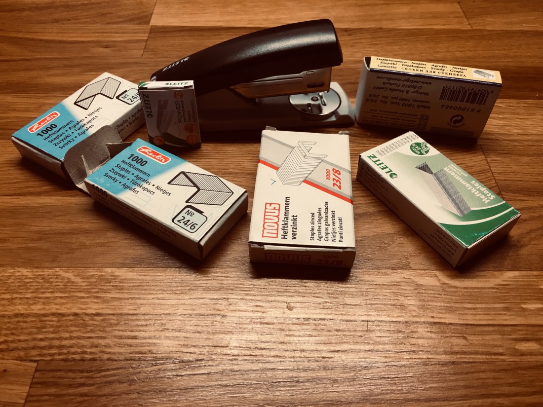Ist Dir schon einmal aufgefallen, dass der Tacker meistens dann ohne Klammern ist, wenn man ihn gerade wirklich braucht? Bei Seife, Kaffee oder Zahnpasta zeichnet es sich schon Tage vorher ab und wer dann nichts besorgt, ist halt selber Schuld. Tacker aber werden von heute auf morgen einfach so „leer“. Und dann beginnt die hektische Suche nach passenden Klammern. Glaubt man dem Internet gibt es ungefähr folgende Sorten: Zitat: „…24/6, 26/6, 26/8, 23/6 für ca. 30, 23/8 für ca. 50, 23/10 für ca. 70  und 23/13 für ca. 100 Blätter ….“ und so weiter. All diese habe ich vermutlich zu Hause im Schreibtisch. Manche sind noch in EVP bepreist, manche in DM und der „neueste Scheiß“ trägt einen Preis in EUR. Endlich habe ich etwas Passendes gefunden und den Klammerblock eingesetzt. Anstatt nun sofort alle anderen Klammersorten in den Müll zu werfen, lasse ich sie mal besser noch im Schubfach. Wer weiß…