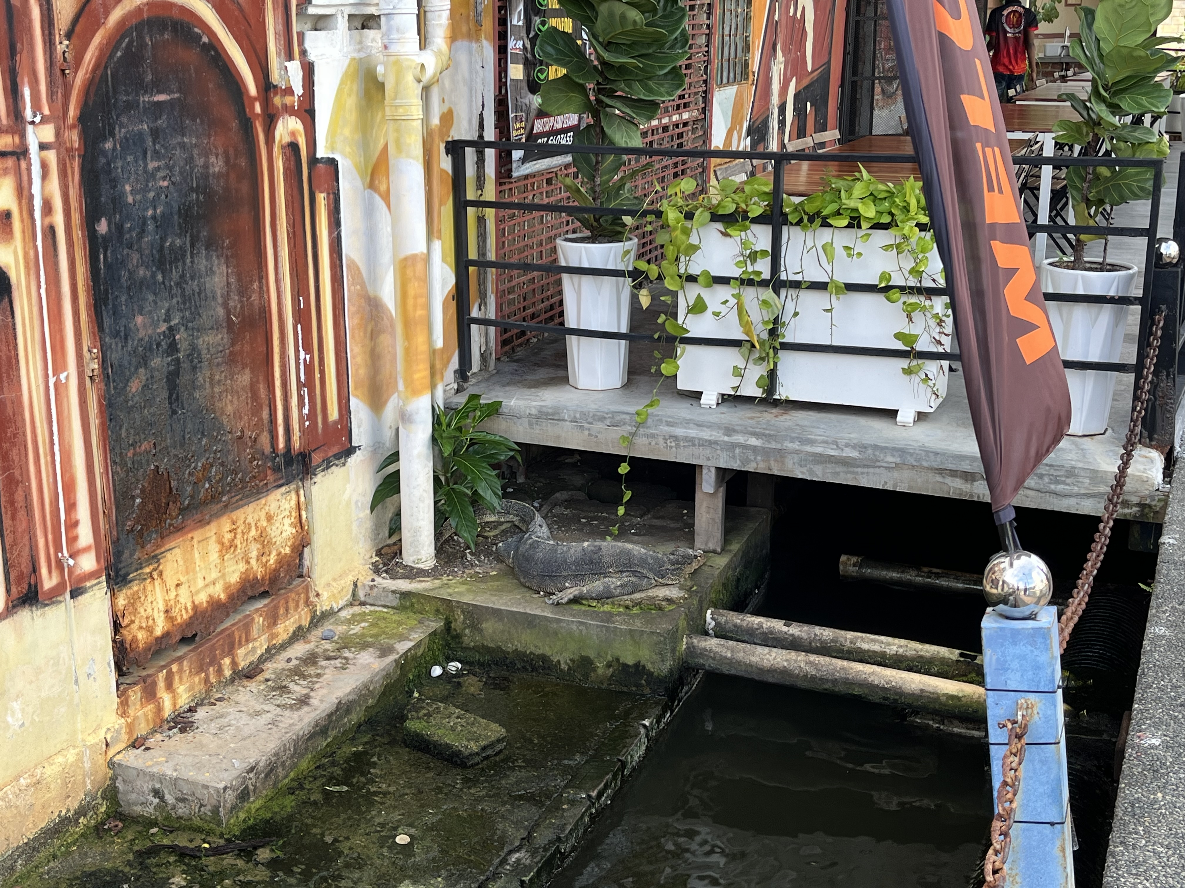 Der nächste Morgen beginnt regnerisch, macht aber nüscht. Is‘ja warm. Im Fluss schlängelt sich wieder ein Waran die Mauer lang.