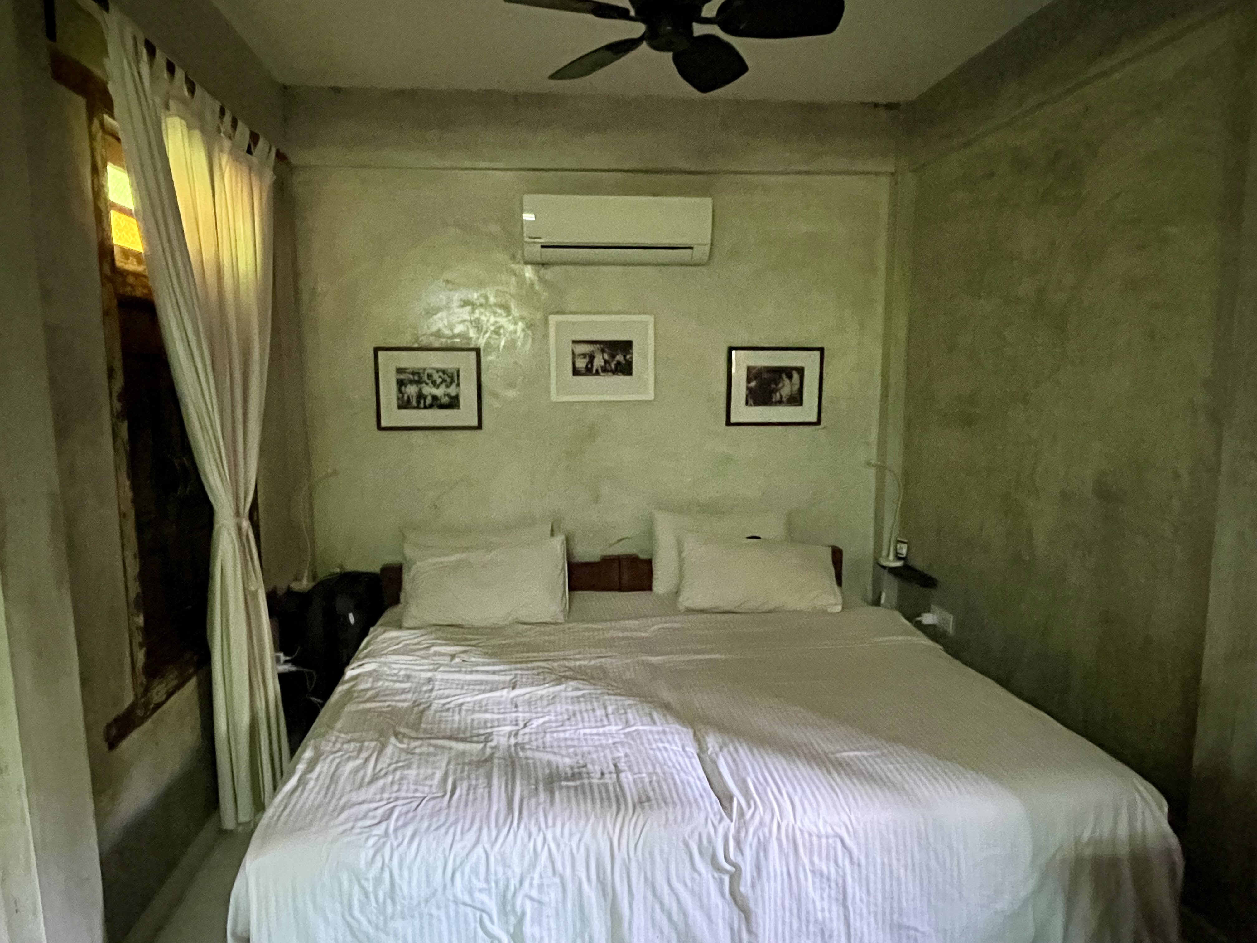 Ein großes Bett steht im Zimmer, auch aus dunklem Holz gefertigt, auf ihm eine feste Matratze, zwei prall gefüllte Kissen und weiße Bettwäsche, darüber ein Fan und eine Klimaanlage.