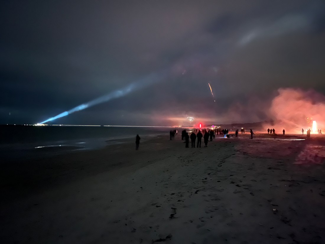 Die Spuren der Silvesternacht waren nahezu verschwunden. Hier und da lag noch eine hölzerne Vierkantleiste oder ein Stück rotes Papier herum. Der Rest des Pyromülls war bereits weggeräumt. Entweder waren das fleißige Menschen in einer konzertierten Aktion oder das Zeug wurde von einer großen Ostsee-Welle mitgerissen. Oder von beidem etwas.